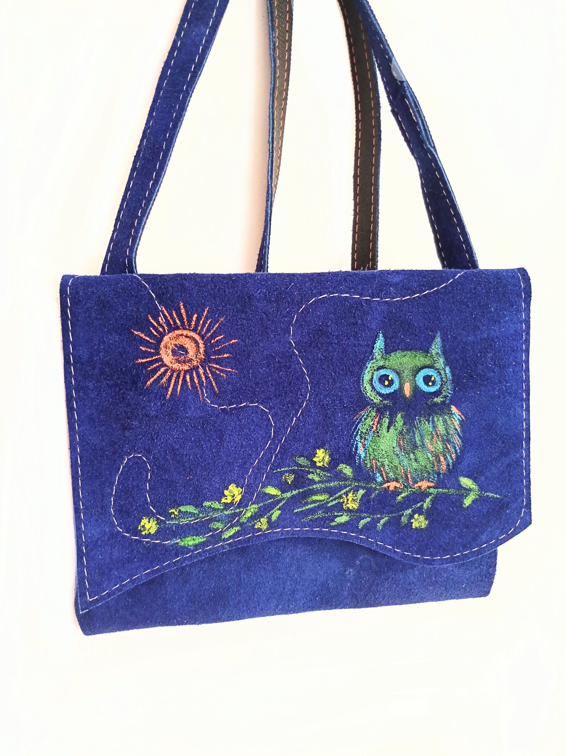 Geantă lucrată manual din piele naturală, concepută în stil jucăuș ,cu simbolul intuiției și al înțelepciunii,o bufnița așezată cuminte pe o ramură,sub căldura soarelui . Este un produs dedicat special persoanelor care adoră culorile, bufnițele și apreciază lucrurile autentice, lucrate cu pasiune, care au o poveste.