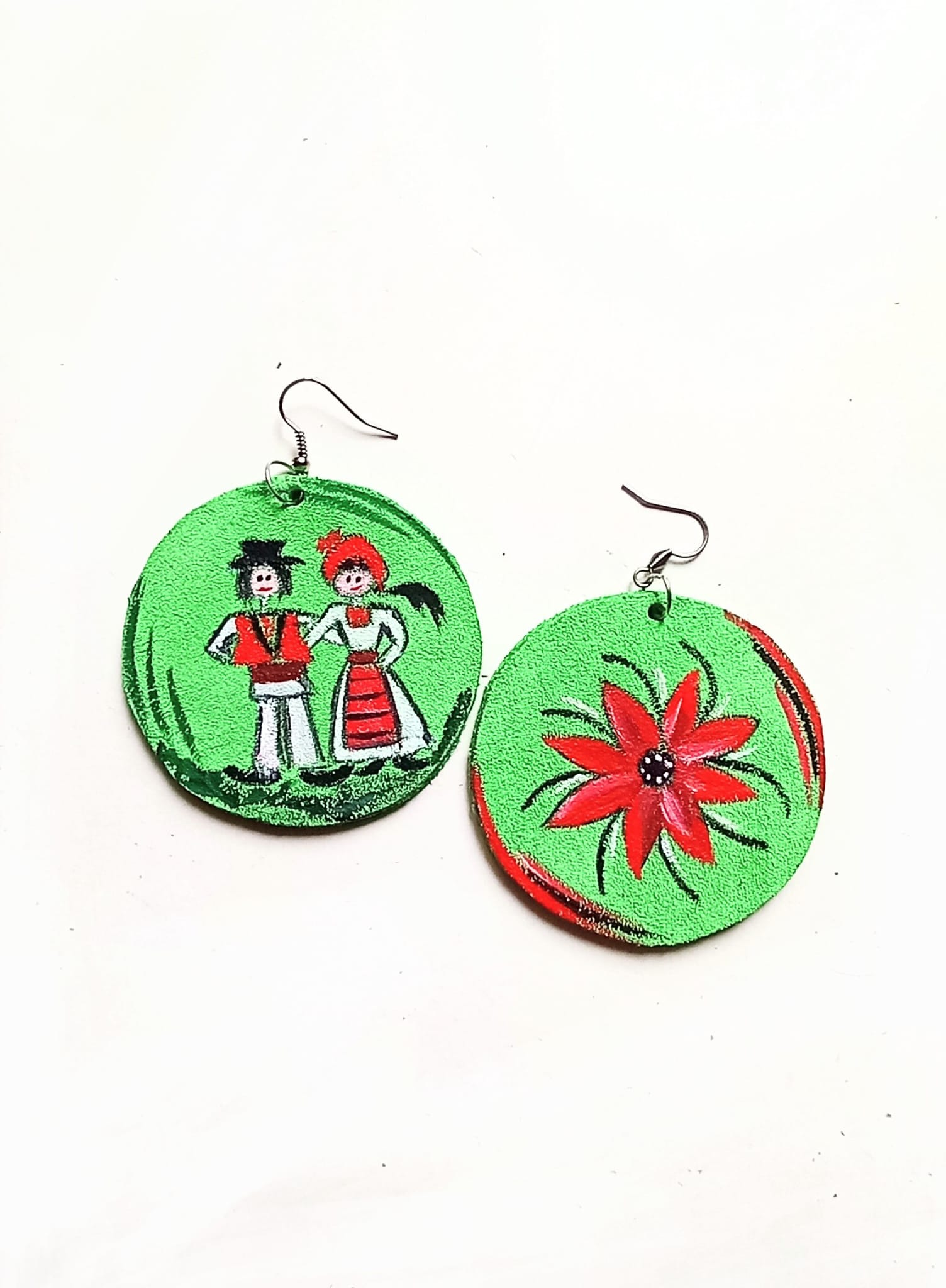 Aceasta pereche de cercei este dedicata persoanelor care știu să aprecieze tradițiile românești , lucrurile autentice și lucrate cu suflet .Sunt decupați și pictați manual pe piele naturală întoarsă , într- o nuanță caldă de verde crud ,sunt foarte ușor de purtat și asortat , in ciuda faptului că sunt supradimensionați.
