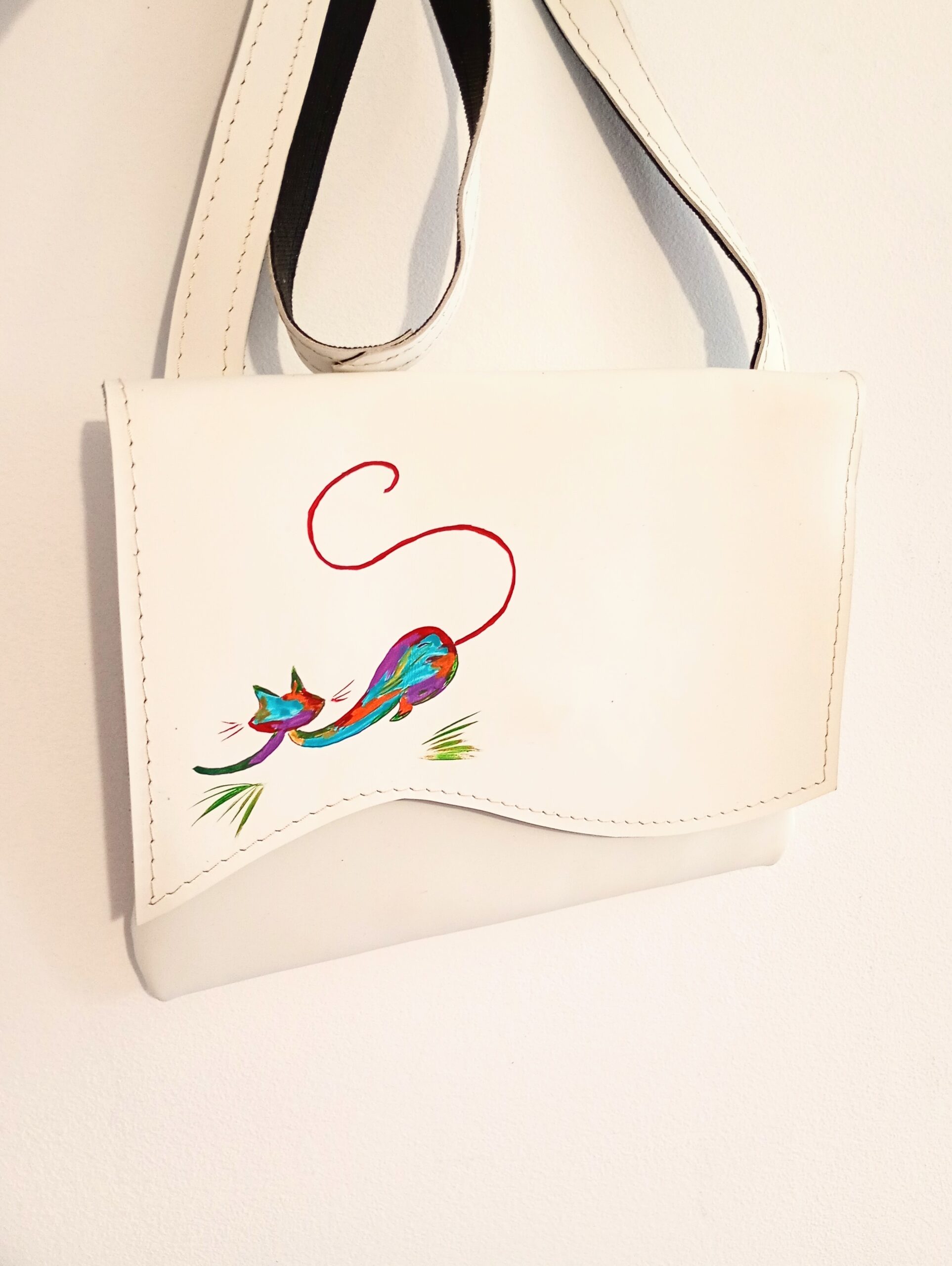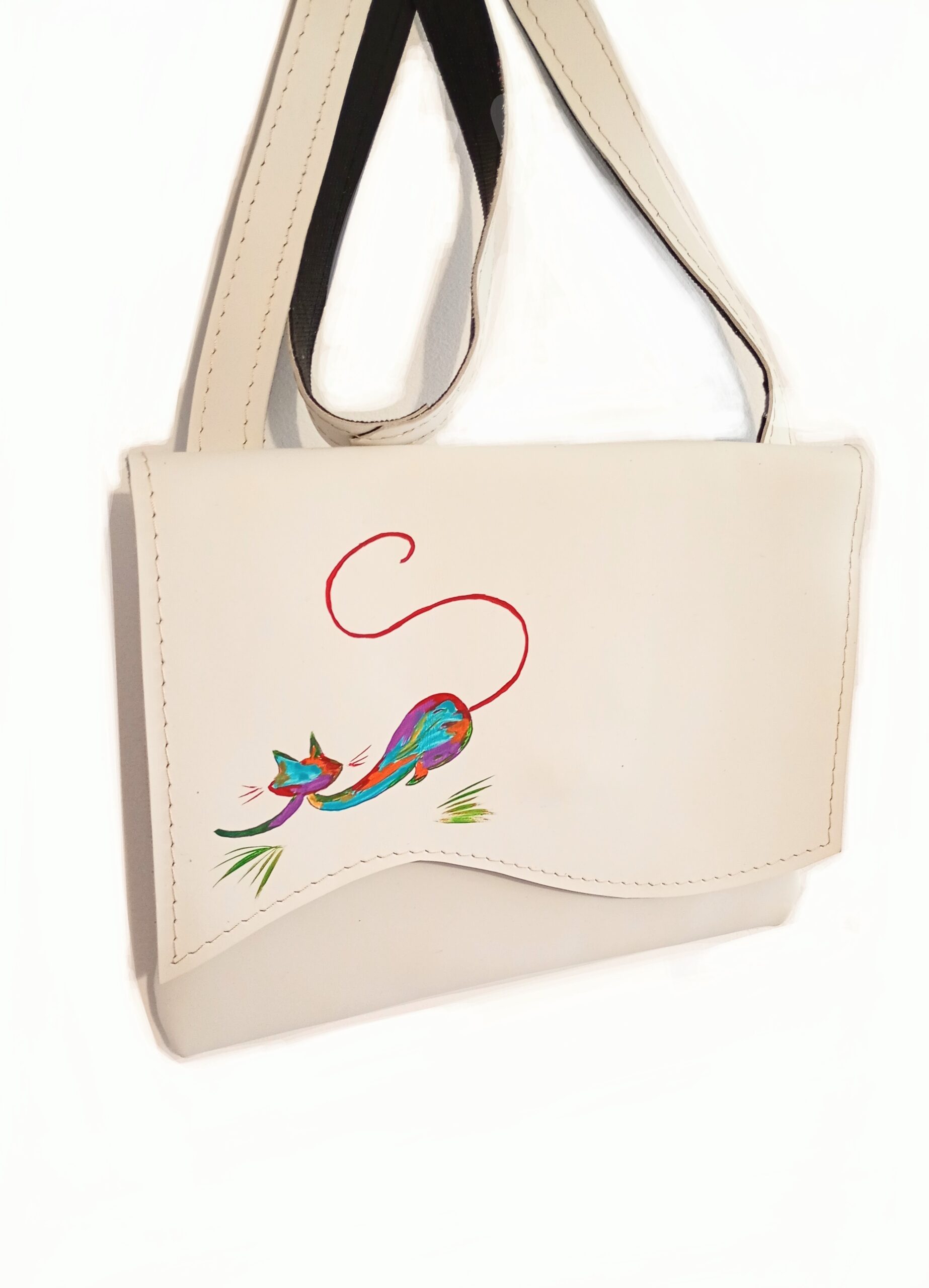 Geanta lucrată manual, accesorizată cu o pisicuță pictată în culori speciale. Este un produs dedicat special persoanelor care adoră pisicuțele și apreciază lucrurile autentice, lucrate cu pasiune, care au o poveste.