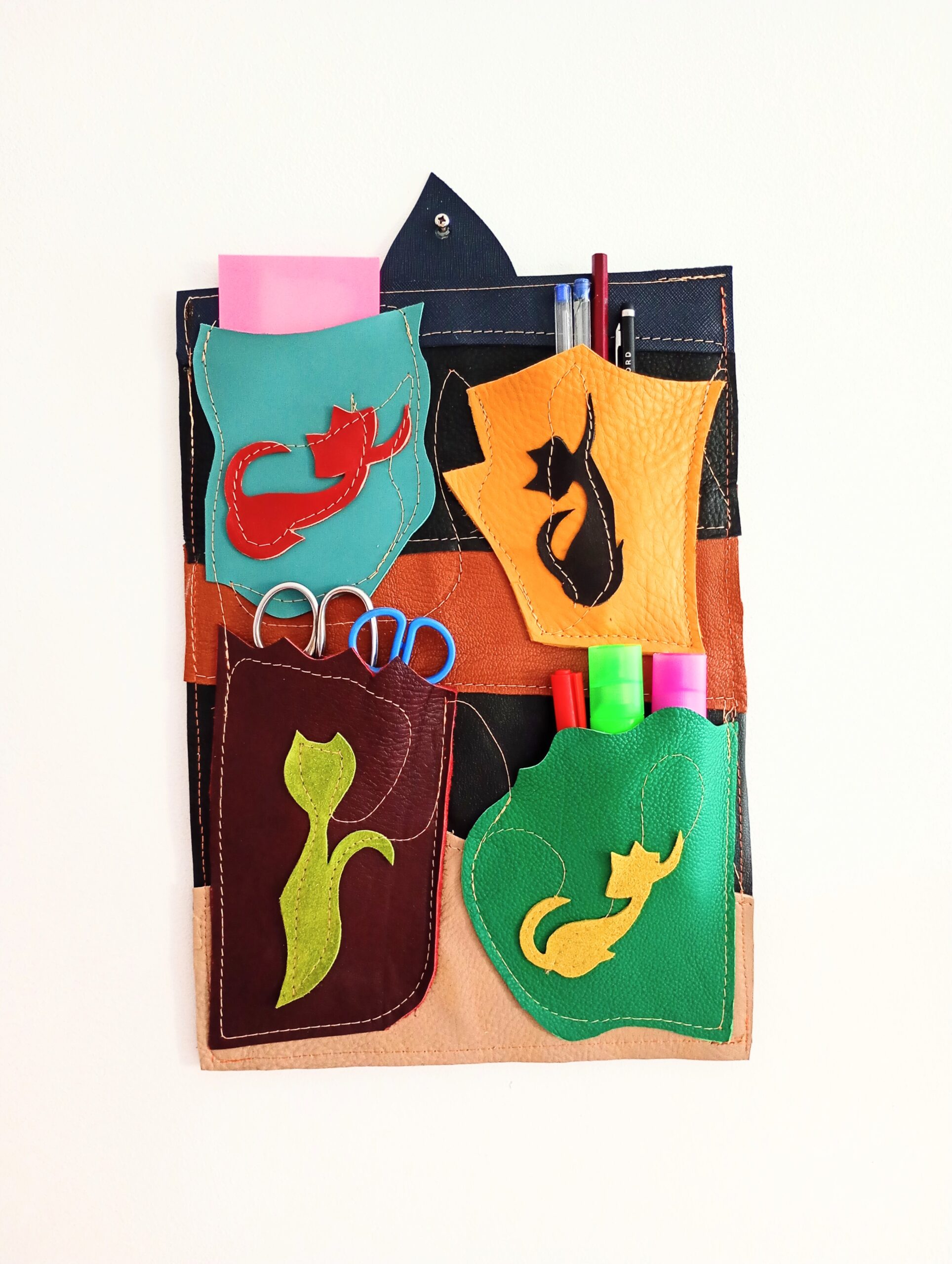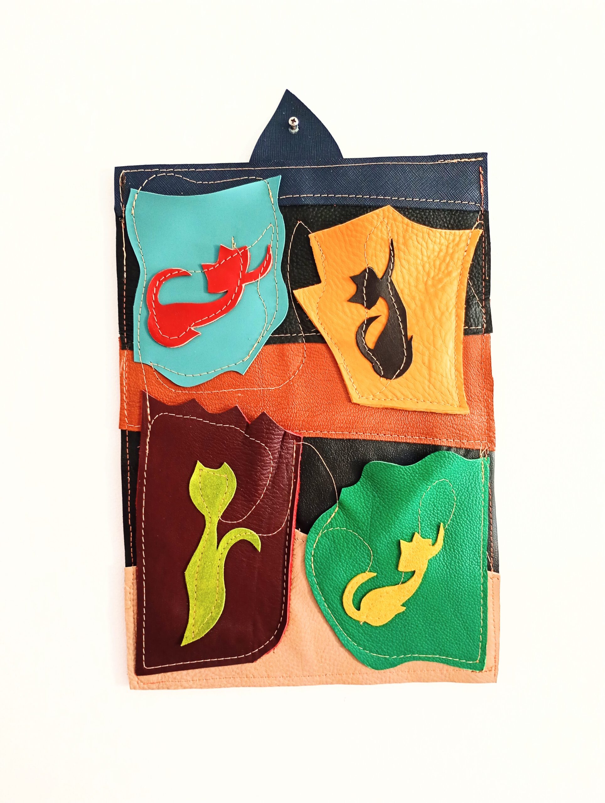 Realizat din piele multicoloră, cu aplicații jucăușe în formă de pisicuțe, acesta nu este doar practic, ci și o adevărată piesă decorativă durabilă, care atrage privirile și aduce un strop de veselie,oriunde îl așezi.