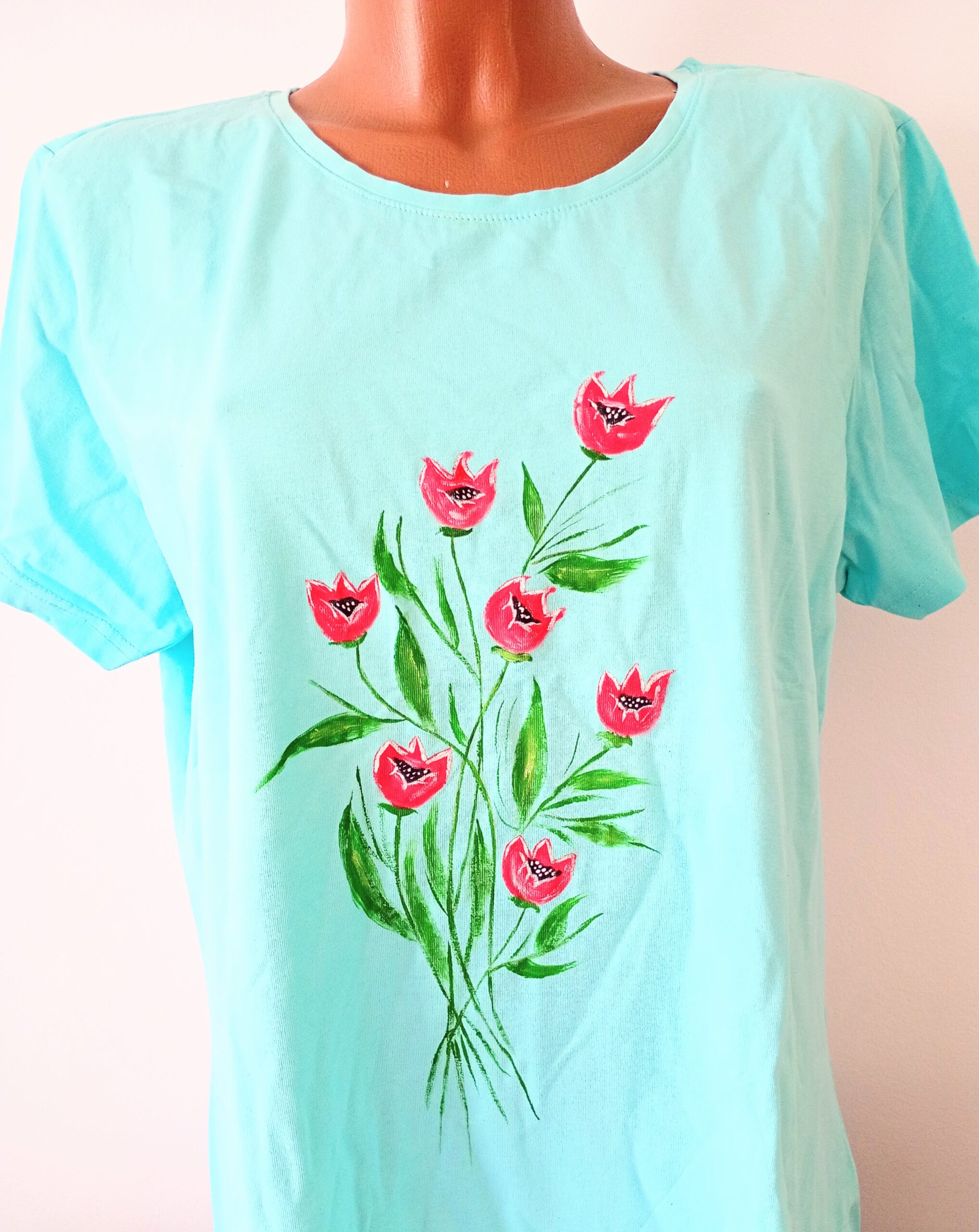 Inedit și plin de culoare, acest tricou bleu din bumbac  pictat manual cu lalele care nu se ofilesc niciodată ,atrage prin delicatețea detaliilor. Fiecare detaliu este realizat cu pasiune, transformându-l intr-un accesoriu artistic ce aduce primăvara în orice ținută. O alegere perfectă pentru femeile care iubesc nuanța cerului ,natura, frumusețea florilor și hainele cu suflet.