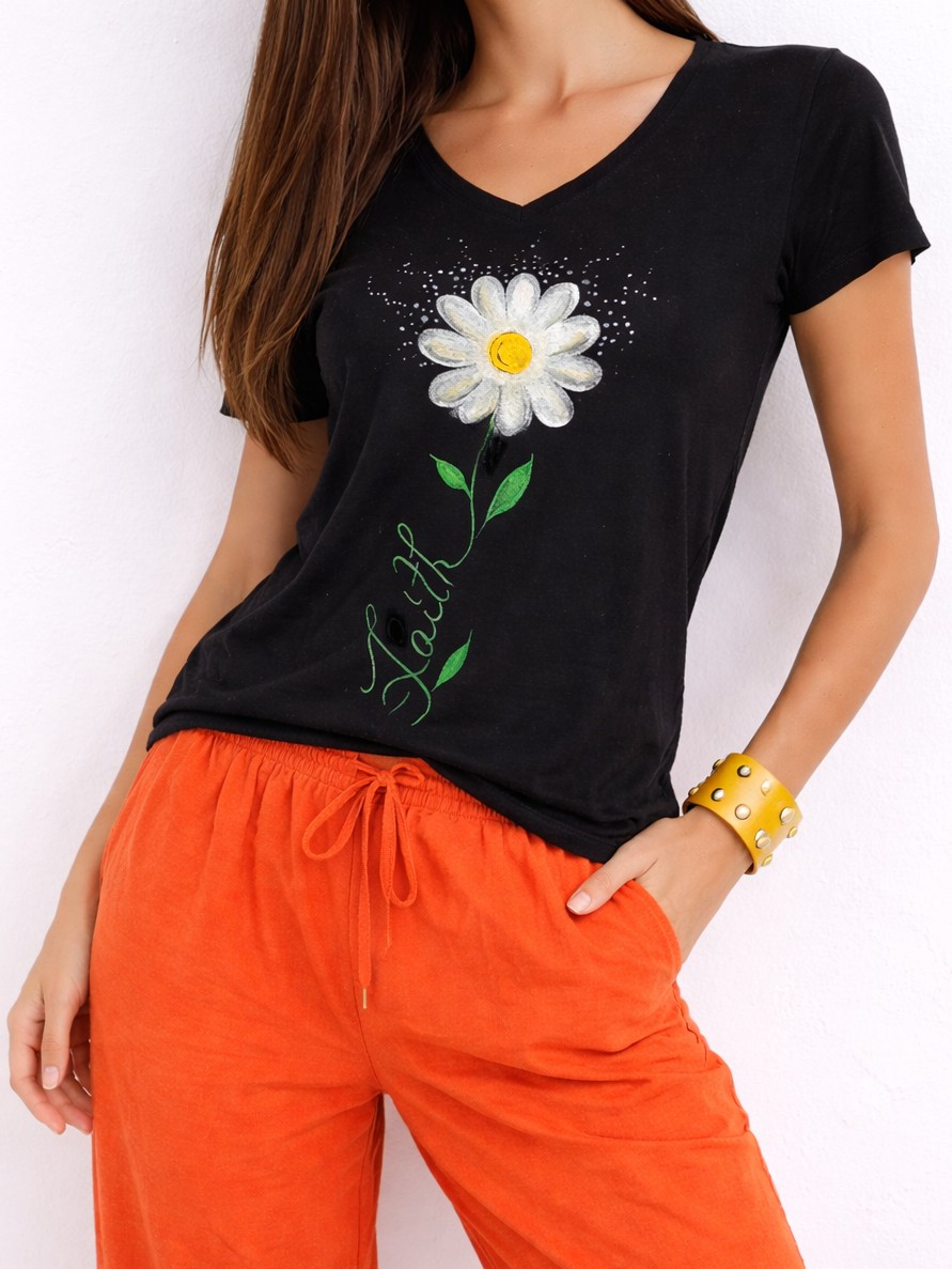 Tricou din bumbac negru, inspirat din frumusețea naturii și a florilor,pictat manual, ce îmbină eleganța cu un mesaj profund. Crizantema albă, delicat conturată, simbolizează puritatea și echilibrul, iar tulpina sa prinde viață prin cuvântul „faith”, scris într-un stil ondulat și armonios. Un design unic, care adaugă personalitate și sens fiecărei ținute.